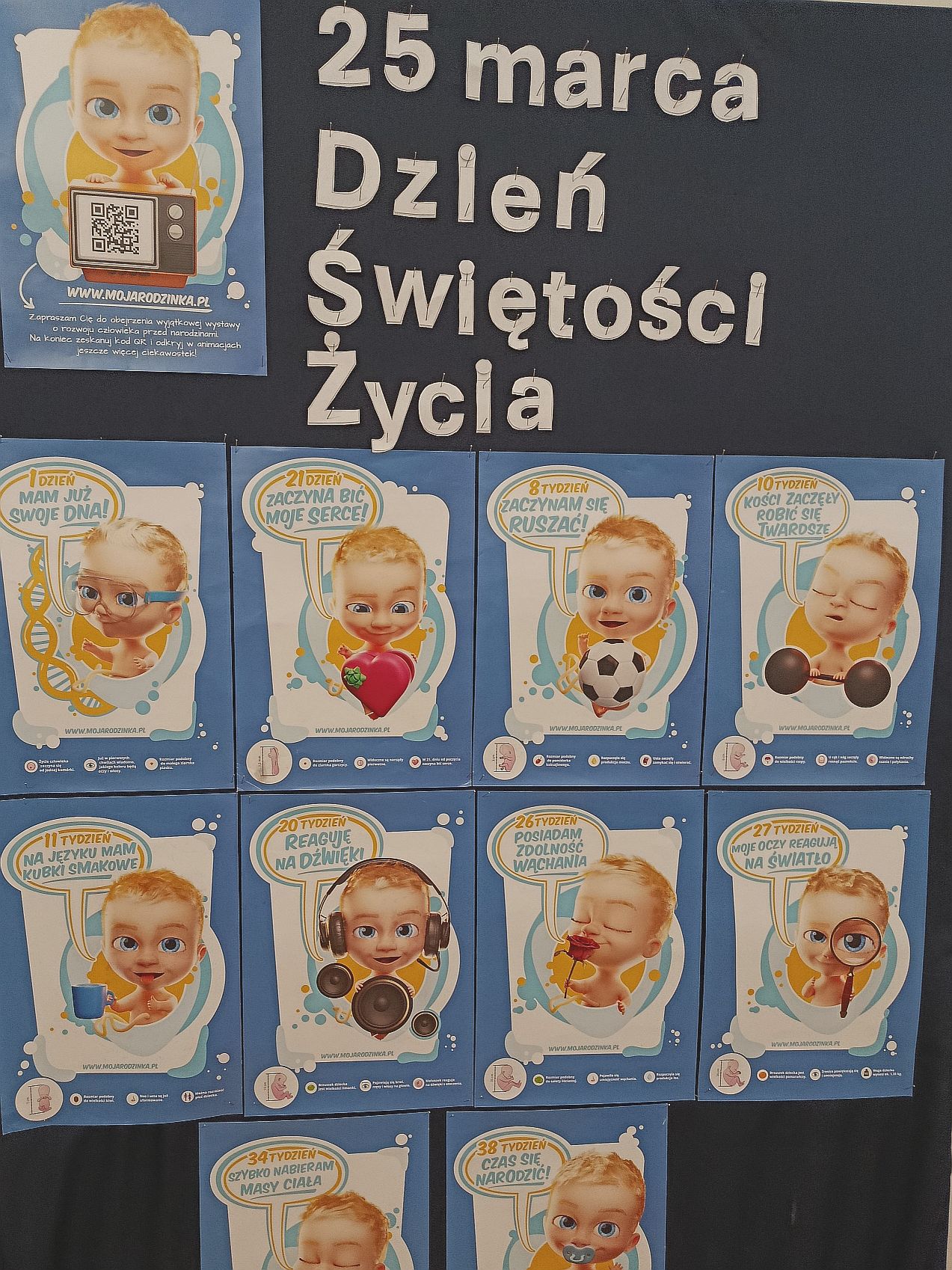 Z tej okazji na holu naszej szkoły została wykonana >>gazetka<< przedstawiająca najważniejsze momenty z życia płodowego dziecka.