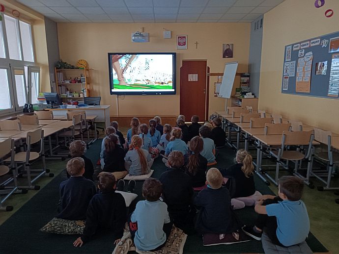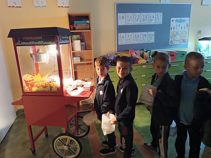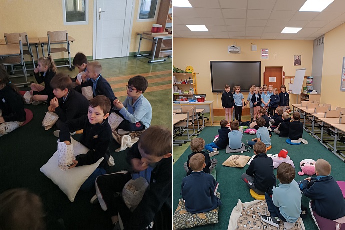 Z tej okazji dziewczynki przygotowały dla kolegów własnoręcznie wykonane laurki oraz serdeczne życzenia, a rodzice zadbali o drobne prezenciki, które sprawiły chłopcom wiele radości. Nie zabrakło też wspólnej zabawy – dzieci obejrzały film „Król Lew”, zajadając się pysznym popcornem.