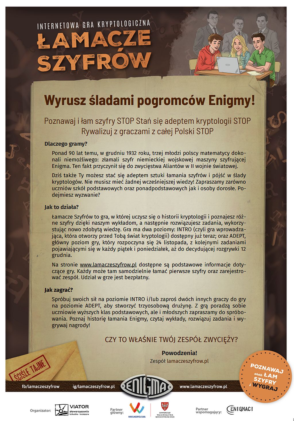 ŁAMACZE SZYFRÓW to bezpłatna, ogólnopolska gra kryptologiczna, w której każdy może wcielić się w agenta kryptowywiadu, a przy tym poznać historię, świetnie się bawić i wygrać nagrody rzeczowe!