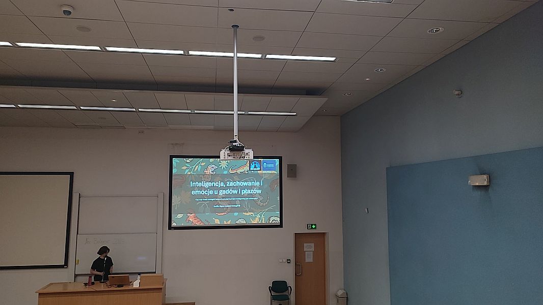 Kolejnym punktem programu był wykład pt.:”Nie tylko psy i delfiny. O inteligencji i komunikacji u gadów.” Dowiedzieliśmy się jak inteligentne mogą być gady i jak dalece mają rozwiniętą komunikację i życie społeczne. Niektóre jaszczurki potrafią cieszyć się na widok swojego właściciela podobnie jak psy.